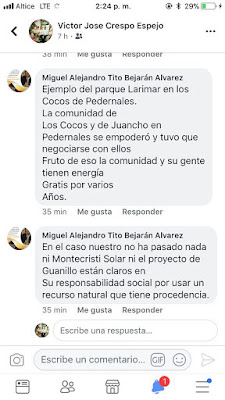 El Presidente Danilo Medina ha mostrado conformidad con este tipo de inversión y un ejemplo fue la reciente inauguración y el anuncio de Punta Catalina que al igual que el (Guanito) Entraran partes de Su generadores en diciembre del presente año, por lo que no entendemos como un director se pone en contra de las decisiones de su presidente Lic. Danilo Medina y del Ing. Rubén Bichara, vicepresidente Ejecutivo de la Corporación de Empresas Eléctricas Estatales (CDEEE) que realizan esfuerzo al junto de promotores internacionales, para propiciar el cambio de la energía tradicional, por energía limpia y el Ing. Miguel Bejarán este convocando actuaciones en contra de estos intereses nacionales en llamado de exigencia ya consensuada por las comunidades y procurando pagos de arbitrios que son funciones de la DGII y los Cabildo Municipales, me preocupa mucho que estas empresas con mucho esfuerzo se instalen en la Frontera Dominicana y quien está llamado a provocar acciones de desarrollo por la frontera o sea su titular este convocando a manifestaciones en toda las zonas costera como lo dejo escrito en conversaciones en las redes sociales.